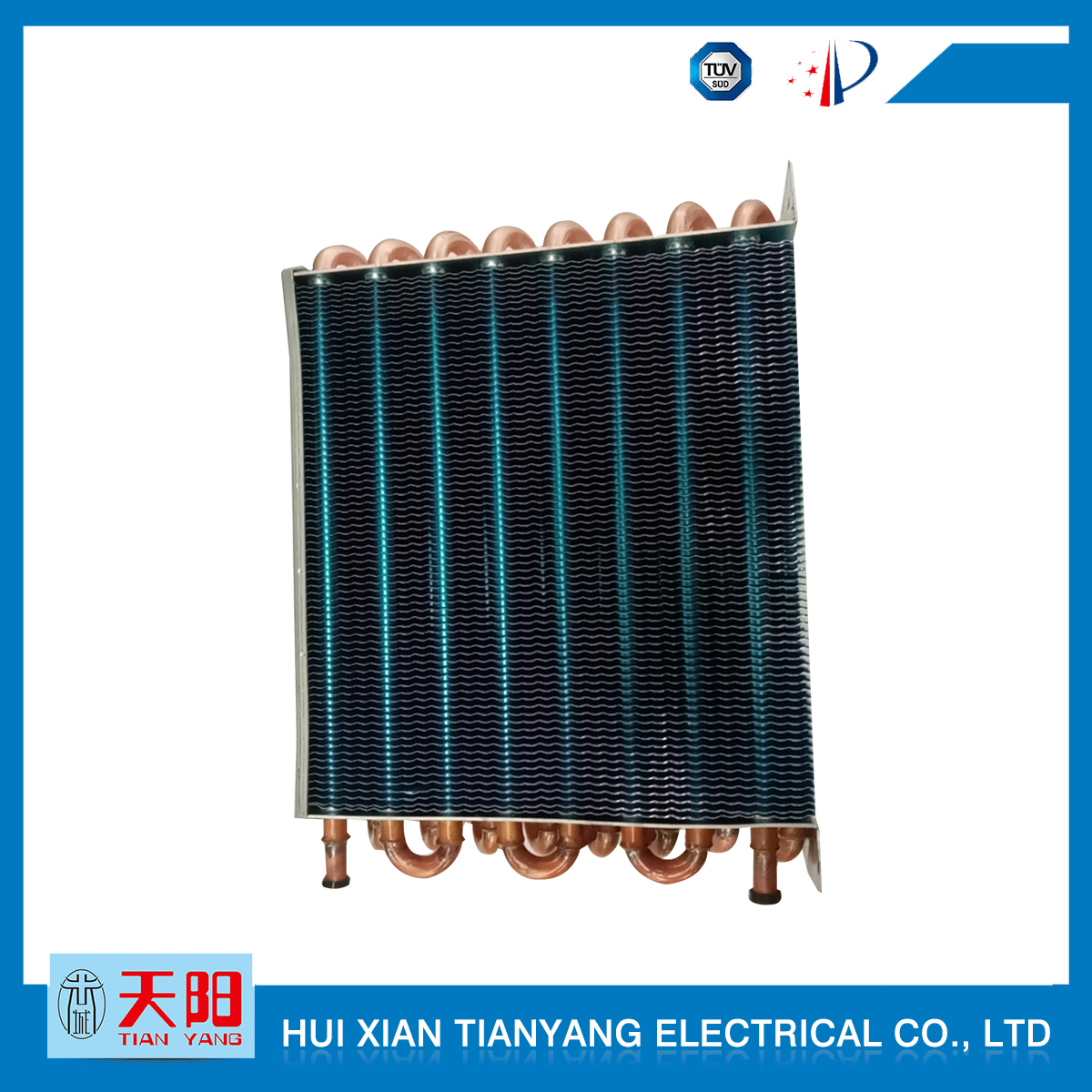 輝縣天陽電器有限責任公司位于肥沃的中原河南省輝縣市學院路中段工業集聚區興業園3號廠房,以制冷設備用冷凝器,蒸發器,熱交換器為主。主要材料為銅管鋁翅片,銅管銅翅片,鋁管鋁翅片。廣泛應用于冰箱冰柜,制冷設備,暖通設備,空調,自動售貨機,冷干機,超市立風柜,冷藏車,烘干機等產品領域。  公司自1998年成立以來,始終堅持:“科技造就產業、質量成就信譽、誠信鑄就輝煌”的質量方針,從產品拓展上堅持“人無我有,人有我優,人優我特的”經營理念,25年來,從1998年開始供應河南冰熊集團下屬的冷柜廠,制冰機廠各種冷凝器;2003年之后,原冰熊集團的精英志士開始在全國各地發展,所到之處依托我公司供貨,以致于多家目前已具行業中佼佼者的公司,從而建立了如凱雪公司,兆邦公司、凌云公司、海寶公司、正雪公司、上海忠云、山東德萊維等幾十余家公司在草創時期的啟蒙供貨商,友好共贏長達十余年,成為我國制冷行業的供應商。以致在2015年初雙匯集團面向社會的招標書中指名要我公司冷凝器、蒸發器指定產品供應商